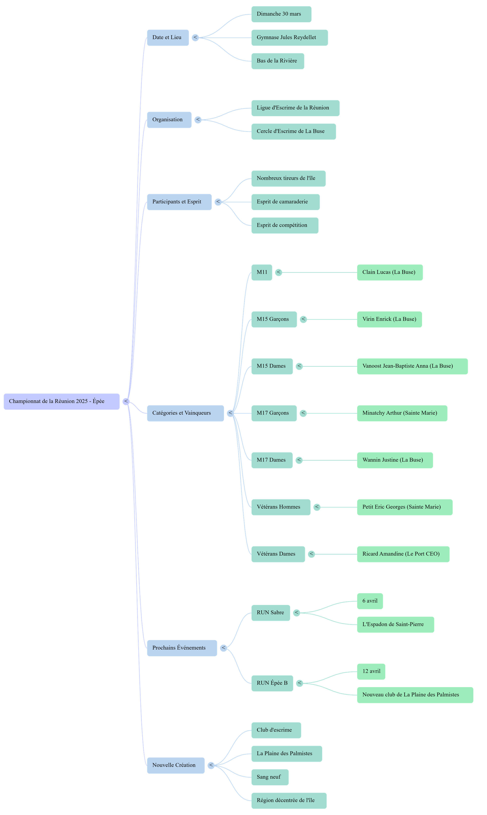 Le Championnat de la RĂ©union Ă©pĂ©e 2025 a Ă©tĂ© un succĂšs pour l'escrime rĂ©unionnaise. Cet Ă©vĂ©nement s'est dĂ©roulĂ© le dimanche 30 mars au gymnase Jules Reydellet Ă Bas de la RiviĂšre. Il a Ă©tĂ© organisĂ© par la Ligue dâEscrime de la RĂ©union en collaboration avec le Cercle dâEscrime de La Buse. Le championnat a rassemblĂ© de nombreux tireurs de lâĂźle, mettant en avant un esprit de camaraderie et de compĂ©tition.