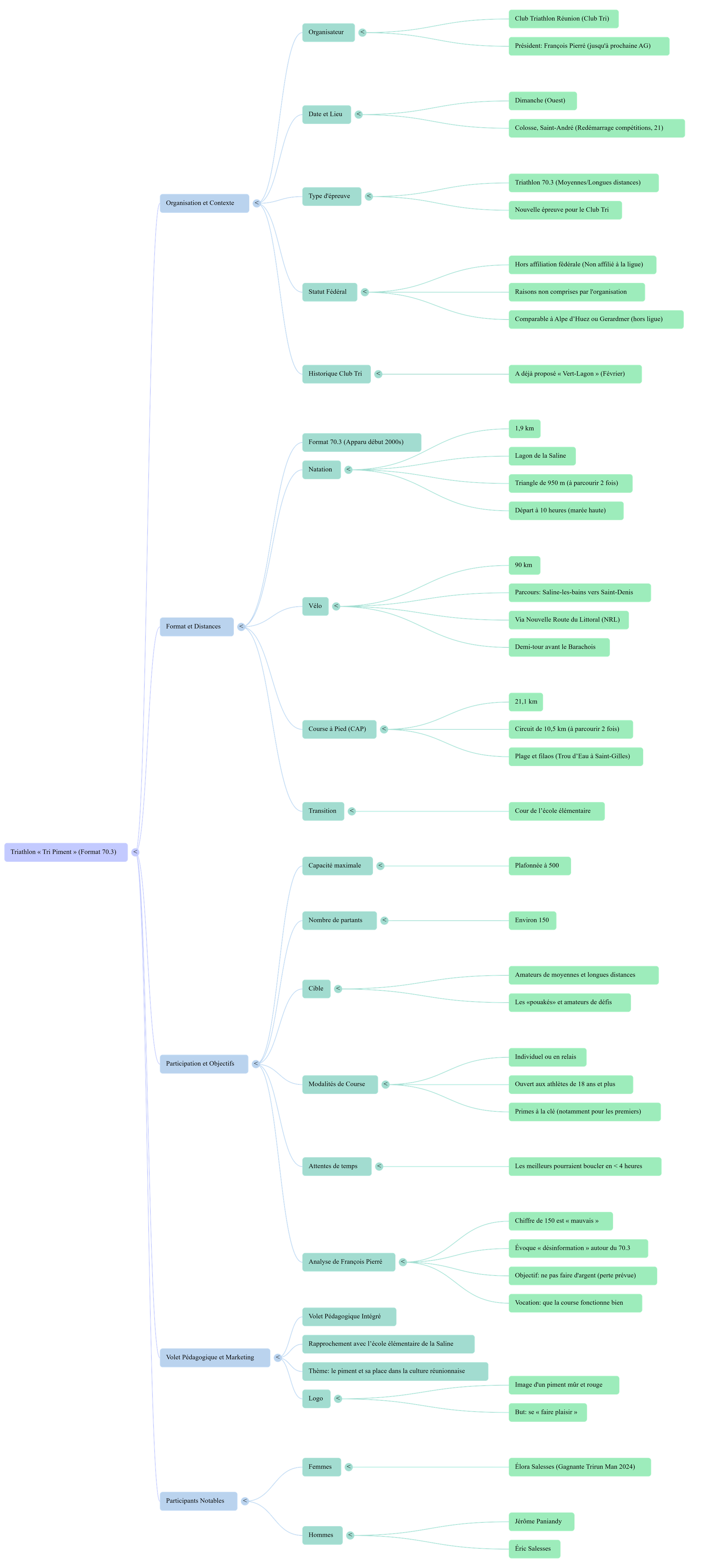 Le Club Tri, prĂ©sidĂ© par François PierrĂ© jusqu'Ă la prochaine assemblĂ©e gĂ©nĂ©rale, a dĂ©jĂ organisĂ© le triathlon «Vert-Lagon» en fĂ©vrier. Ce nouveau 70.3 est une Ă©preuve nouvelle pour l'Ă©quipe organisatrice. Le format 70.3 (qui permet dâaccĂ©der aux longues distances) est apparu dans la discipline au dĂ©but des annĂ©es 2000 et a gagnĂ© en popularitĂ©, s'ancrant sur l'Ăźle en 2024 avec le premier «Trirun Man».