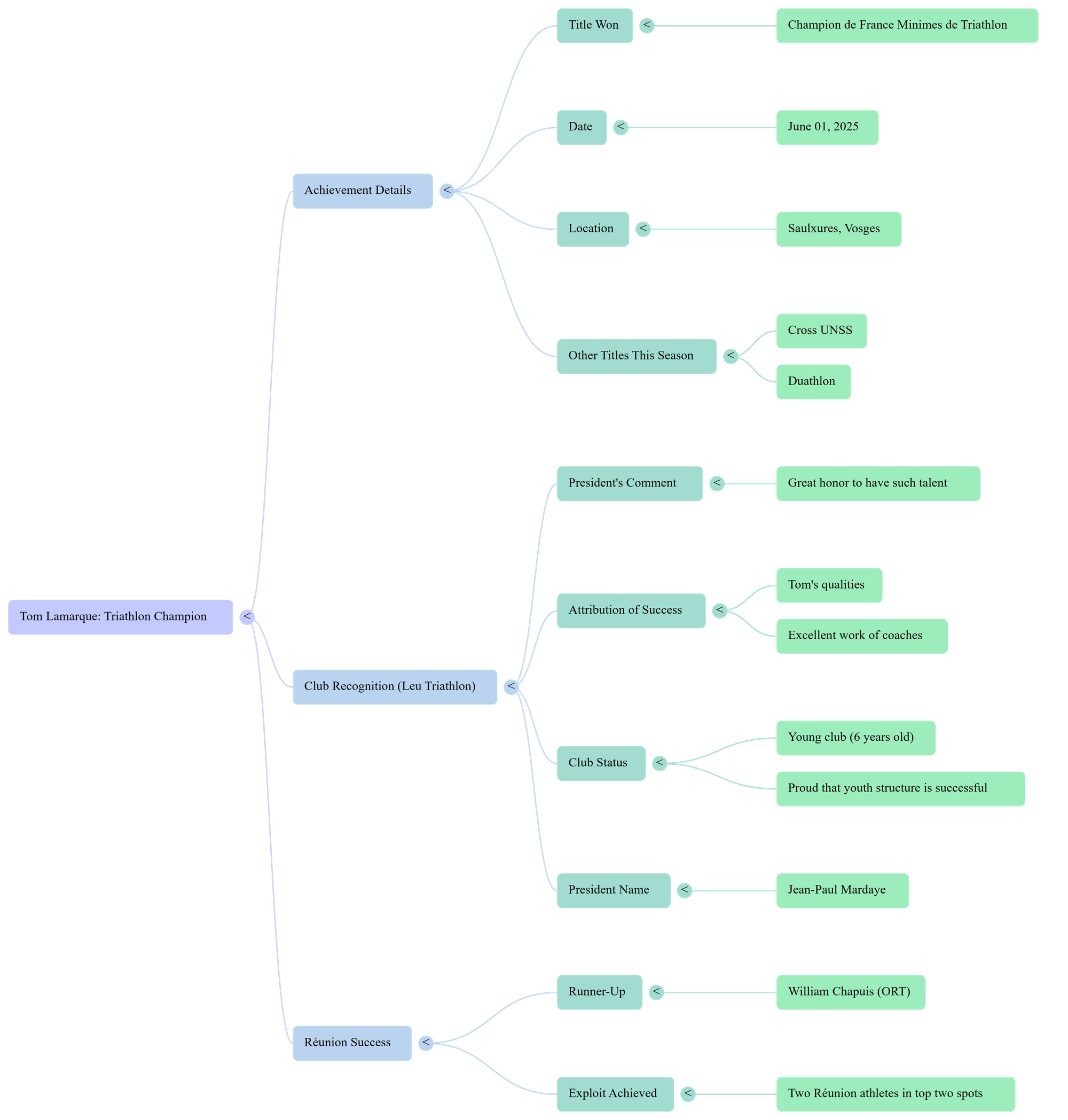 The president of the Lamarque club, Leu Triathlon , Jean-Paul Mardaye, commented on this event. He considers that this performance is due to the qualities of the athlete as well as the "excellent work of his coaches." Mardaye also expressed pride in his club, Leu Triathlon, which is a young organization (barely six years old). He is pleased to see that the structure put in place around young athletes is bearing fruit so quickly.